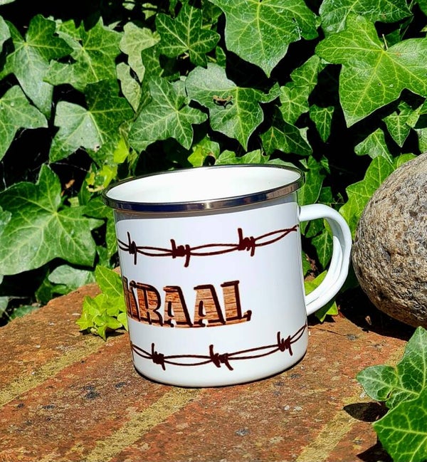 Enamel mugs with imprinted logos are ink infused into the mug and are hand wash and dishwasher safe.